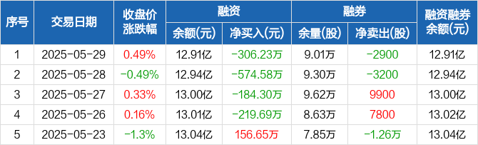中泰证券融资融券信息显示,2025年5月29日融资净偿还306.23万元;融资余额12.91亿元,较前一日下降0.24%。