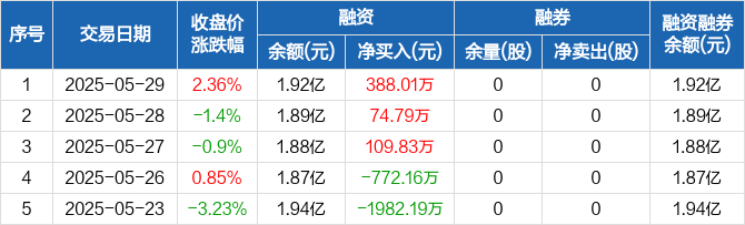 融资方面,当日融资买入1189.05万元,融资偿还801.04万元,融资净买入388.01万元,连续3日净买入累计572.63万元。融券方面,融券卖出0股,融券偿还0股,融券余量0股,融券余额0元。融资融券余额合计1.92亿元。
