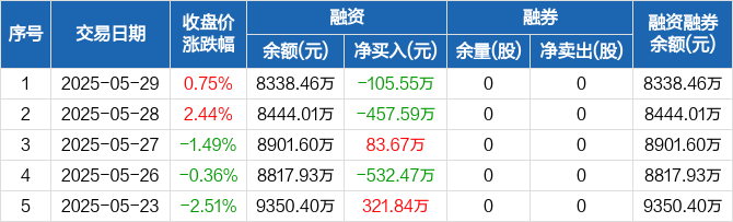 融资方面,当日融资买入169.35万元,融资偿还274.91万元,融资净偿还105.55万元。融券方面,融券卖出0股,融券偿还0股,融券余量0股,融券余额0元。融资融券余额合计8338.46万元。