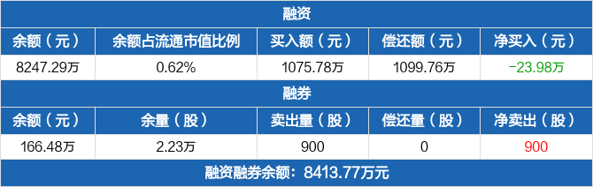 融资方面,当日融资买入1075.78万元,融资偿还1099.76万元,融资净偿还23.98万元,连续3日净偿还累计538.34万元。融券方面,融券卖出900股,融券偿还0股,融券余量2.23万股,融券余额166.48万元。融资融券余额合计8413.77万元。
