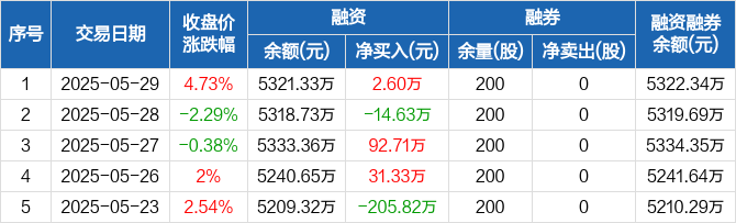 融资方面,当日融资买入398.47万元,融资偿还395.87万元,融资净买入2.6万元。融券方面,融券卖出0股,融券偿还0股,融券余量200股,融券余额1.01万元。融资融券余额合计5322.34万元。