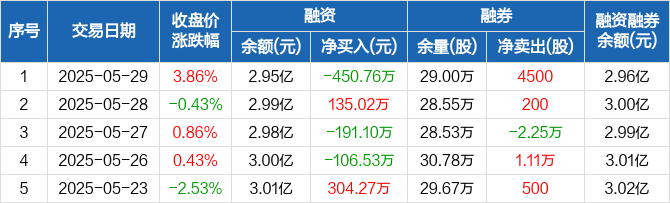 融资方面,当日融资买入736.86万元,融资偿还1187.62万元,融资净偿还450.76万元。融券方面,融券卖出4600股,融券偿还100股,融券余量29万股,融券余额140.36万元。融资融券余额合计2.96亿元。
