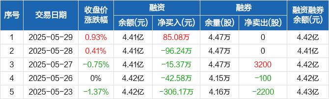 融资方面,当日融资买入1631.97万元,融资偿还1546.89万元,融资净买入85.08万元。融券方面,融券卖出0股,融券偿还0股,融券余量4.47万股,融券余额77.47万元。融资融券余额合计4.42亿元。
