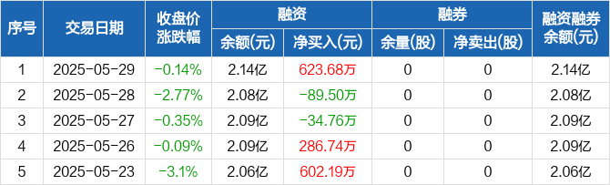 融资方面,当日融资买入2122.86万元,融资偿还1499.18万元,融资净买入623.68万元。融券方面,融券卖出0股,融券偿还0股,融券余量0股,融券余额0元。融资融券余额合计2.14亿元。