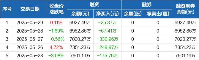 融资方面,当日融资买入524.96万元,融资偿还550.33万元,融资净偿还25.37万元,连续8日净偿还累计1722.74万元。融券方面,融券卖出0股,融券偿还0股,融券余量0股,融券余额0元。融资融券余额合计6927.49万元。
