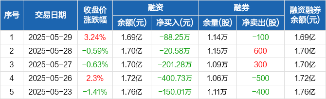 融资方面,当日融资买入698.66万元,融资偿还786.91万元,融资净偿还88.25万元,连续5日净偿还累计860.85万元。融券方面,融券卖出0股,融券偿还100股,融券余量1.14万股,融券余额31.59万元。融资融券余额合计1.69亿元。