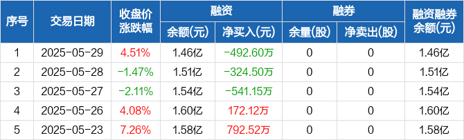 融资方面,当日融资买入864.54万元,融资偿还1357.14万元,融资净偿还492.6万元,连续3日净偿还累计1358.25万元。融券方面,融券卖出0股,融券偿还0股,融券余量0股,融券余额0元。融资融券余额合计1.46亿元。