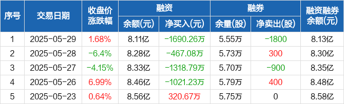 融资方面,当日融资买入2827.51万元,融资偿还4517.77万元,融资净偿还1690.26万元,连续4日净偿还累计4497.36万元。融券方面,融券卖出0股,融券偿还1800股,融券余量5.55万股,融券余额178.38万元。融资融券余额合计8.13亿元。