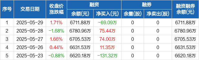 融资方面,当日融资买入110.56万元,融资偿还179.65万元,融资净偿还69.09万元。融券方面,融券卖出0股,融券偿还0股,融券余量0股,融券余额0元。融资融券余额合计6711.88万元。