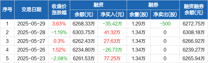 融资方面,当日融资买入91.66万元,融资偿还127.08万元,融资净偿还35.42万元。融券方面,融券卖出0股,融券偿还500股,融券余量1.29万股,融券余额4.42万元。融资融券余额合计6272.75万元。