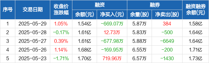 融资方面,当日融资买入420.81万元,融资偿还1089.88万元,融资净偿还669.07万元。融券方面,融券卖出384股,融券偿还0股,融券余量5.87万股,融券余额317.45万元。融资融券余额合计1.58亿元。