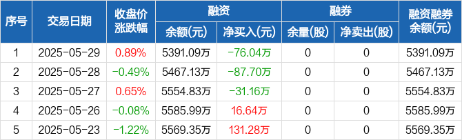 融资方面,当日融资买入100.46万元,融资偿还176.5万元,融资净偿还76.04万元,连续3日净偿还累计194.9万元。融券方面,融券卖出0股,融券偿还0股,融券余量0股,融券余额0元。融资融券余额合计5391.09万元。