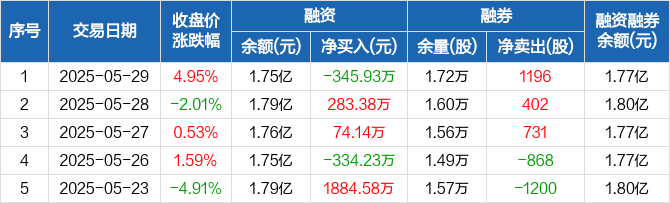 融资方面,当日融资买入2377.93万元,融资偿还2723.86万元,融资净偿还345.93万元。融券方面,融券卖出1498股,融券偿还302股,融券余量1.72万股,融券余额161.95万元。融资融券余额合计1.77亿元。
