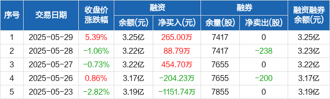 融资方面,当日融资买入2243.89万元,融资偿还1978.89万元,融资净买入265万元,连续3日净买入累计808.5万元。融券方面,融券卖出0股,融券偿还0股,融券余量7417股,融券余额34.93万元。融资融券余额合计3.25亿元。