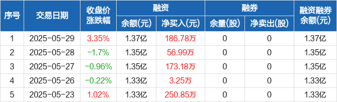融资方面,当日融资买入670.79万元,融资偿还484.01万元,融资净买入186.78万元,连续5日净买入累计671.04万元。融券方面,融券卖出0股,融券偿还0股,融券余量0股,融券余额0元。融资融券余额合计1.37亿元。