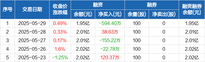 融资方面,当日融资买入607.79万元,融资偿还1202.19万元,融资净偿还594.4万元。融券方面,融券卖出0股,融券偿还0股,融券余量100股,融券余额1219元。融资融券余额合计1.95亿元。