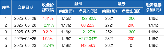 融资方面,当日融资买入513.22万元,融资偿还636.04万元,融资净偿还122.82万元。融券方面,融券卖出0股,融券偿还200股,融券余量2521股,融券余额13.66万元。融资融券余额合计1.16亿元。