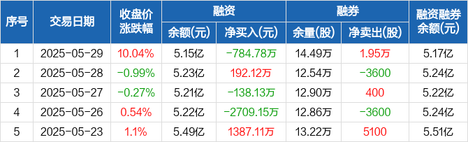 融资方面,当日融资买入6044.86万元,融资偿还6829.64万元,融资净偿还784.78万元。融券方面,融券卖出1.95万股,融券偿还0股,融券余量14.49万股,融券余额174.75万元。融资融券余额合计5.17亿元。