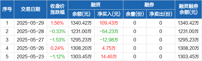 融资方面,当日融资买入355.85万元,融资偿还246.42万元,融资净买入109.43万元。融券方面,融券卖出0份,融券偿还0份,融券余量0份,融券余额0元。融资融券余额合计1340.42万元。