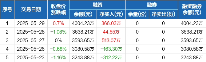 融资方面,当日融资买入2516.79万元,融资偿还2150.77万元,融资净买入366.03万元,连续3日净买入累计923.65万元。融券方面,融券卖出0份,融券偿还0份,融券余量0份,融券余额0元。融资融券余额合计4004.23万元。