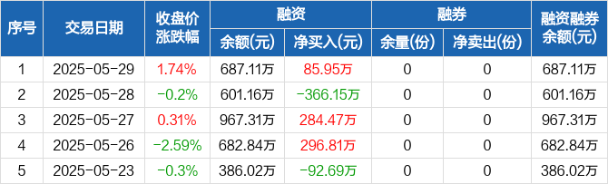 融资方面,当日融资买入1397.1万元,融资偿还1311.15万元,融资净买入85.95万元。融券方面,融券卖出0份,融券偿还0份,融券余量0份,融券余额0元。融资融券余额合计687.11万元。