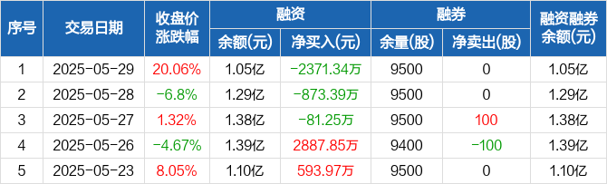 融资方面,当日融资买入2246.78万元,融资偿还4618.12万元,融资净偿还2371.34万元,净偿还额创历史新高,连续3日净偿还累计3325.98万元。融券方面,融券卖出0股,融券偿还0股,融券余量9500股,融券余额8.13万元。融资融券余额合计1.05亿元。