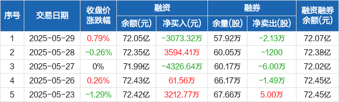 融资方面,当日融资买入2.38亿元,融资偿还2.68亿元,融资净偿还3073.32万元。融券方面,融券卖出2.04万股,融券偿还4.17万股,融券余量57.92万股,融券余额222.99万元。融资融券余额合计72.07亿元。