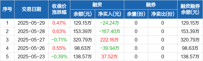融资方面,当日融资买入251.6万元,融资偿还275.84万元,融资净偿还24.24万元。融券方面,融券卖出0份,融券偿还0份,融券余量0份,融券余额0元。融资融券余额合计129.15万元。