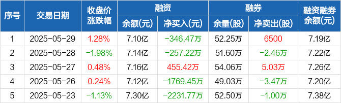 中兵红箭融资融券信息显示,2025年5月29日融资净偿还346.47万元;融资余额7.1亿元,较前一日下降0.49%。