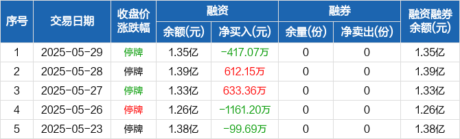 融资方面,当日融资买入20.26万元,融资偿还437.32万元,融资净偿还417.07万元。融券方面,融券卖出0份,融券偿还0份,融券余量0份,融券余额0元。融资融券余额合计1.35亿元。