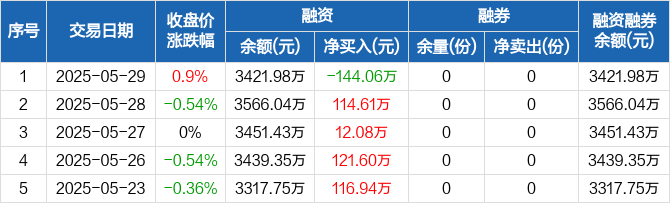 融资方面,当日融资买入151.87万元,融资偿还295.93万元,融资净偿还144.06万元。融券方面,融券卖出0份,融券偿还0份,融券余量0份,融券余额0元。融资融券余额合计3421.98万元。