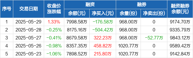 融资方面,当日融资买入456.67万元,融资偿还633.24万元,融资净偿还176.58万元。融券方面,融券卖出0份,融券偿还0份,融券余量968万份,融券余额1176.12万元。融资融券余额合计9174.7万元。