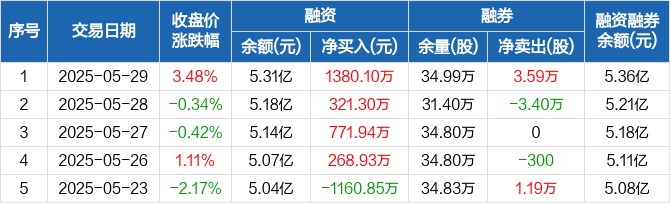 融资方面,当日融资买入8003.89万元,融资偿还6623.8万元,融资净买入1380.1万元,连续4日净买入累计2742.26万元。融券方面,融券卖出3.59万股,融券偿还0股,融券余量34.99万股,融券余额426.18万元。融资融券余额合计5.36亿元。