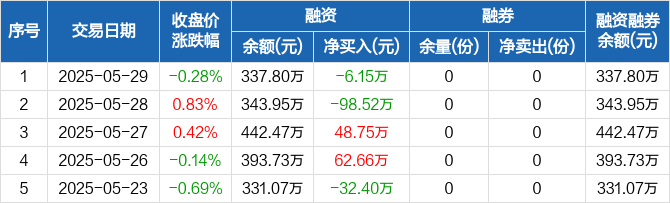 融资方面,当日融资买入11.74万元,融资偿还17.89万元,融资净偿还6.15万元。融券方面,融券卖出0份,融券偿还0份,融券余量0份,融券余额0元。融资融券余额合计337.8万元。
