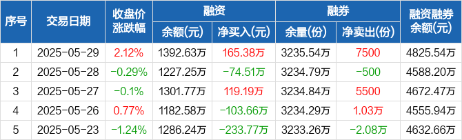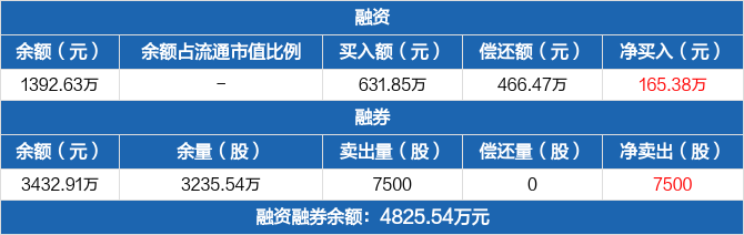 融资方面,当日融资买入631.85万元,融资偿还466.47万元,融资净买入165.38万元。融券方面,融券卖出7500份,融券偿还0份,融券余量3235.54万份,融券余额3432.91万元。融资融券余额合计4825.54万元。