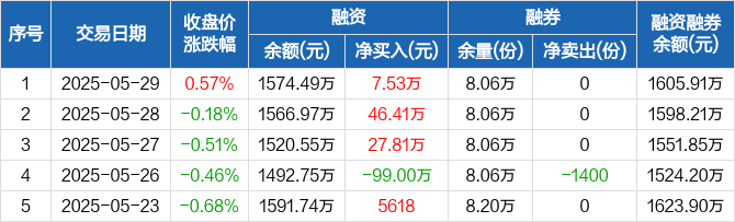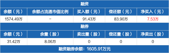 融资方面,当日融资买入91.43万元,融资偿还83.9万元,融资净买入7.53万元,连续3日净买入累计81.75万元。融券方面,融券卖出0份,融券偿还0份,融券余量8.06万份,融券余额31.42万元。融资融券余额合计1605.91万元。