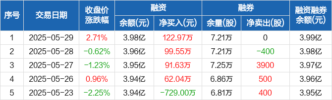 融资方面,当日融资买入1139.62万元,融资偿还1016.65万元,融资净买入122.97万元,连续4日净买入累计376.19万元。融券方面,融券卖出100股,融券偿还100股,融券余量7.21万股,融券余额153.19万元。融资融券余额合计3.99亿元。
