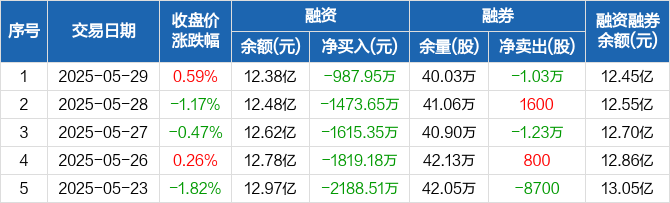 融资方面,当日融资买入3027.06万元,融资偿还4015.01万元,融资净偿还987.95万元,连续5日净偿还累计8084.64万元。融券方面,融券卖出1800股,融券偿还1.21万股,融券余量40.03万股,融券余额750.96万元。融资融券余额合计12.45亿元。