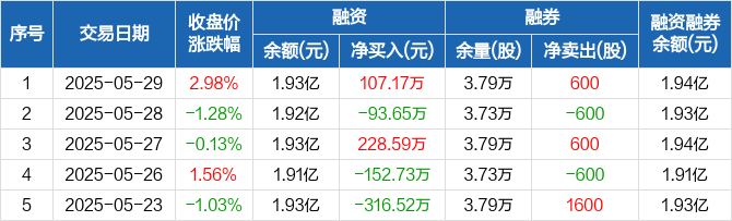 融资方面,当日融资买入835.91万元,融资偿还728.74万元,融资净买入107.17万元。融券方面,融券卖出600股,融券偿还0股,融券余量3.79万股,融券余额30.09万元。融资融券余额合计1.94亿元。