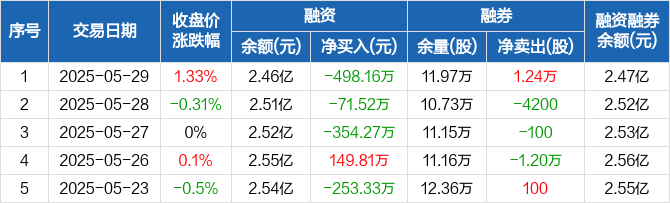 融资方面,当日融资买入201.99万元,融资偿还700.14万元,融资净偿还498.16万元,连续3日净偿还累计923.94万元。融券方面,融券卖出1.26万股,融券偿还200股,融券余量11.97万股,融券余额118.14万元。融资融券余额合计2.47亿元。