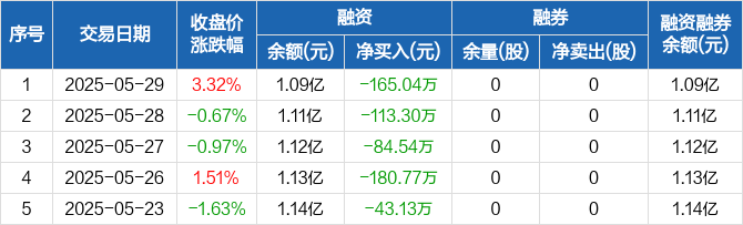 融资方面,当日融资买入508.35万元,融资偿还673.39万元,融资净偿还165.04万元,连续5日净偿还累计586.78万元。融券方面,融券卖出0股,融券偿还0股,融券余量0股,融券余额0元。融资融券余额合计1.09亿元。