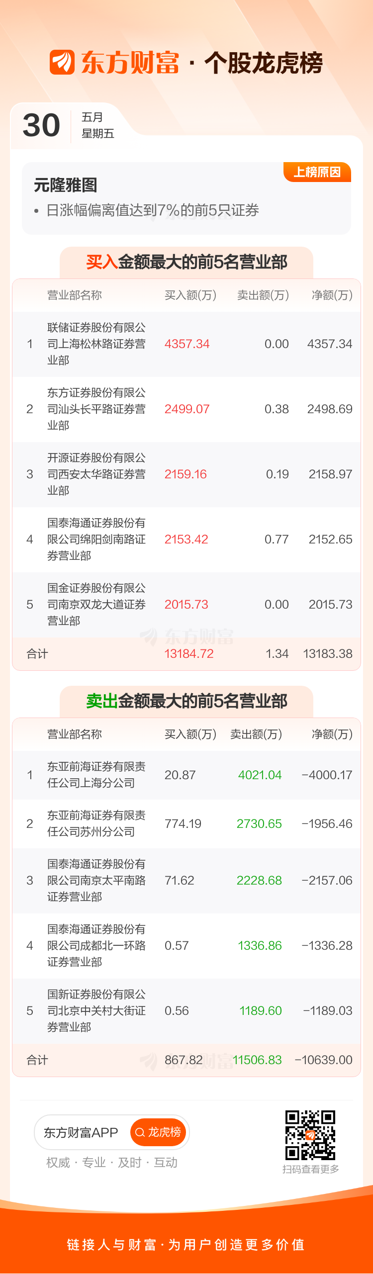 交易所2025年5月30日公布的交易公开信息显示,元隆雅图因成为日涨幅偏离值达到7%的前5只证券、连续三个交易日内,涨幅偏离值累计达到20%的证券上榜。元隆雅图当日收报19.15元,涨跌幅9.99%,偏离值11.06%,换手率15.34%,成交额6.87亿。异常期间5月29日至5月30日,期间涨幅20.97%,累计偏离值20.64%,区间成交额12.71亿。