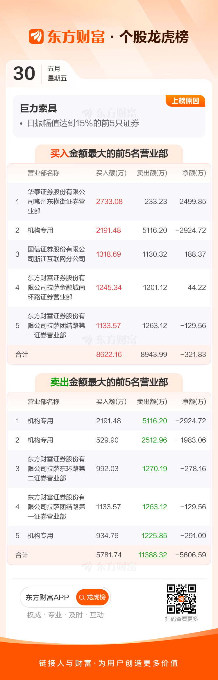 交易所2025年5月30日公布的交易公开信息显示,巨力索具因成为日振幅值达到15%的前5只证券上榜。巨力索具当日收报5.88元,涨跌幅1.03%,偏离值15.20%,换手率24.19%,成交额13.29亿。