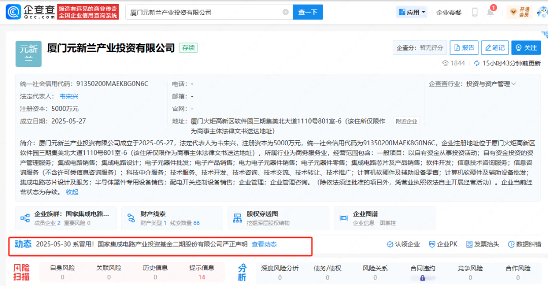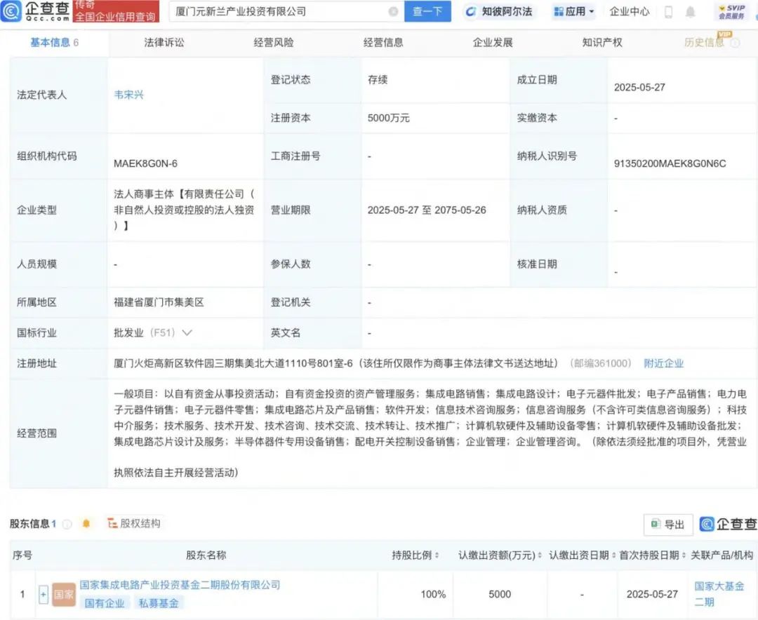 企查查显示,厦门元新兰产业投资有限公司于2025年5月27日成立,注册资本5000万元,经营范围包括,以自有资金从事投资活动;自有资金投资的资产管理服务;集成电路销售;集成电路设计等。企查查股权穿透显示,该公司由国家集成电路产业投资基金二期股份有限公司全资持股。