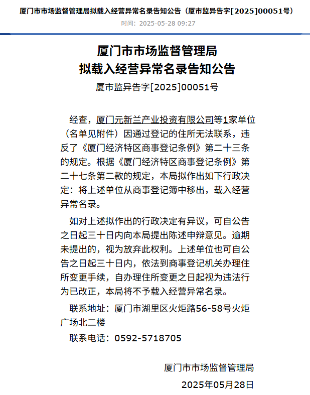 记者注意到,早在5月28日,厦门市市场监督管理局已发布公告,拟将厦门元新兰产业投资有限公司载入经营异常名录。