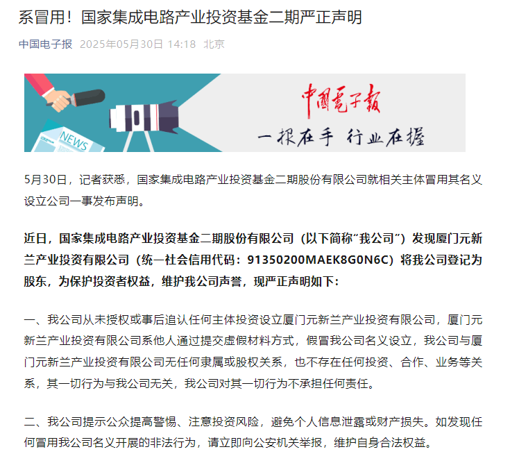 5月30日,中国电子报在官方微信号发表文章称,国家集成电路产业投资基金二期股份有限公司(简称“大基金二期”)就相关主体冒用其名义设立公司一事发布严正声明,表示其与厦门元新兰产业投资有限公司无任何隶属或股权关系,也不存在任何投资、合作、业务等关系。
