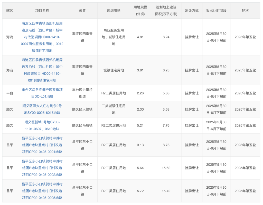5月30日,北京市规划和自然资源委员会网站发布2025年度第五轮拟供应商品住宅用地清单,共涉及8宗地块,土地面积约33公顷,建筑规模约72万平方米,上述用地将于2025年6月下旬前供应。