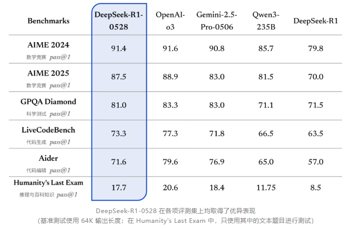 具体来看,DeepSeek-R1-0528 仍然使用 2024 年 12 月所发布的 DeepSeek V3 Base 模型作为基座,但在后续训练过程中投入了更多算力,显著提升了模型的思维深度与推理能力。更新后的R1模型在数学、编程与通用逻辑等多个基准测评中取得了当前国内所有模型中首屈一指的优异成绩,并且在整体表现上已接近其他国际顶尖模型,如o3与 Gemini-2.5-Pro。