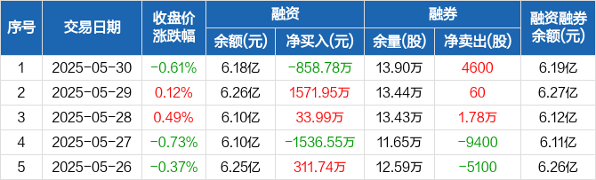 融资方面,当日融资买入4371.45万元,融资偿还5230.23万元,融资净偿还858.78万元。融券方面,融券卖出3.02万股,融券偿还2.56万股,融券余量13.9万股,融券余额113.01万元。融资融券余额合计6.19亿元。