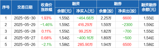 融资方面,当日融资买入972.79万元,融资偿还1437.47万元,融资净偿还464.68万元。融券方面,融券卖出6800股,融券偿还200股,融券余量2.25万股,融券余额20.16万元。融资融券余额合计1.55亿元。